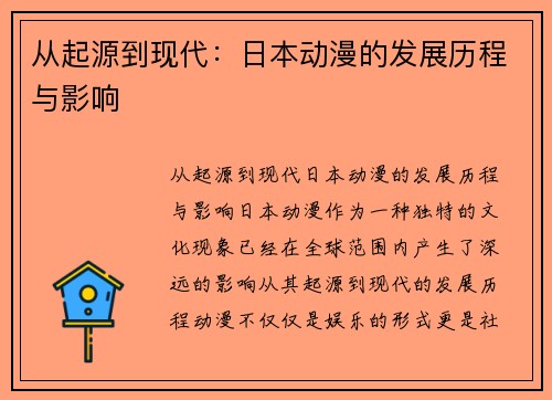 从起源到现代:日本动漫的发展历程与影响 日本动漫,作为一种独特的文化现象,已经在全球范围内产生了深远的影响。从其起源到现代的发展历程,动漫不仅仅是娱乐的形式,更是社会、文化和艺术的综合体现。本文将...